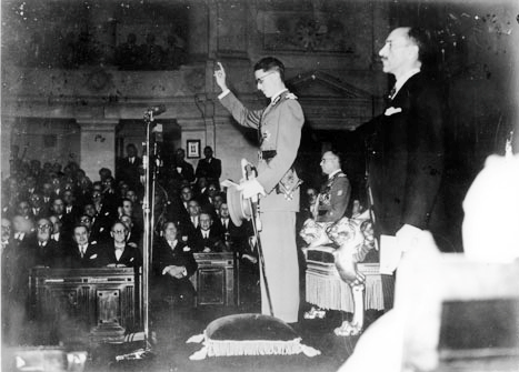 | Le Roi Léopold III transmet sa charge à son fils Baudouin le 16 juillet 1951. |