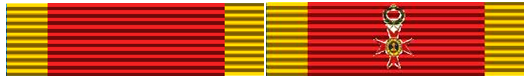 La cinta de la Orden es de seda roja con franjas amarillas, inspirada en los colores de la ciudad de Roma.